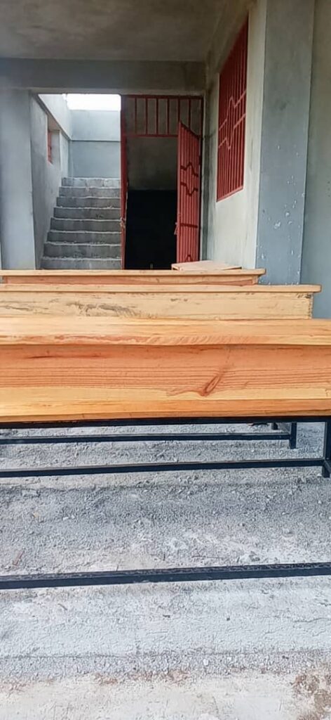 Les bancs ont été fabriqués sur place par un forgeron bénévole et un ébéniste de la zone durant la semaine Sainte. À la réouverture des classes, nos élèves ont été heureux de retrouver dans leur classe des bancs neufs leur permettant de mieux s’assoir pour mieux apprendre.