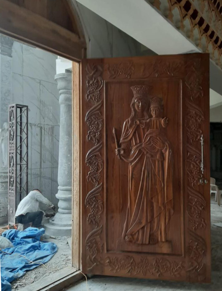Un vantail de la porte d’entrée avec Marie Mère de Dieu