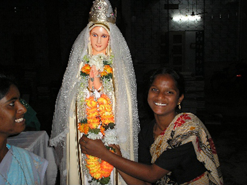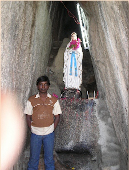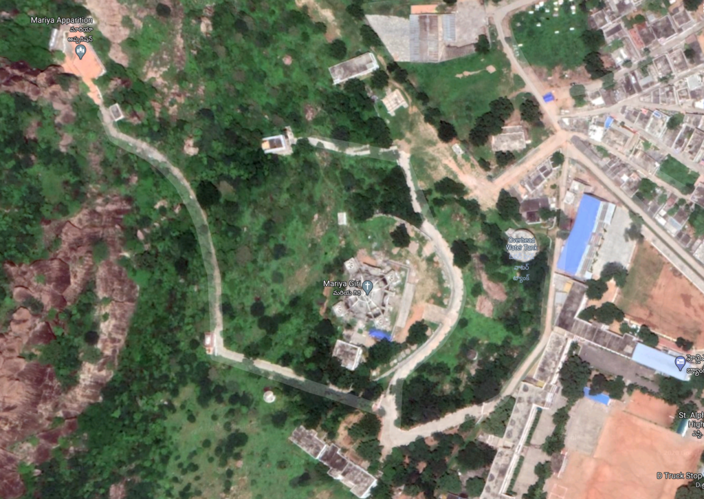 - La petite communauté chrétienne (environ 1,5 % de la population dans l’état de Telangana) est servie par le personnel du diocèse situé au centre de la ville, tout près d’un mont sur lequel elle dispose d’un terrain où une grotte abrite une statue de la Vierge Marie.