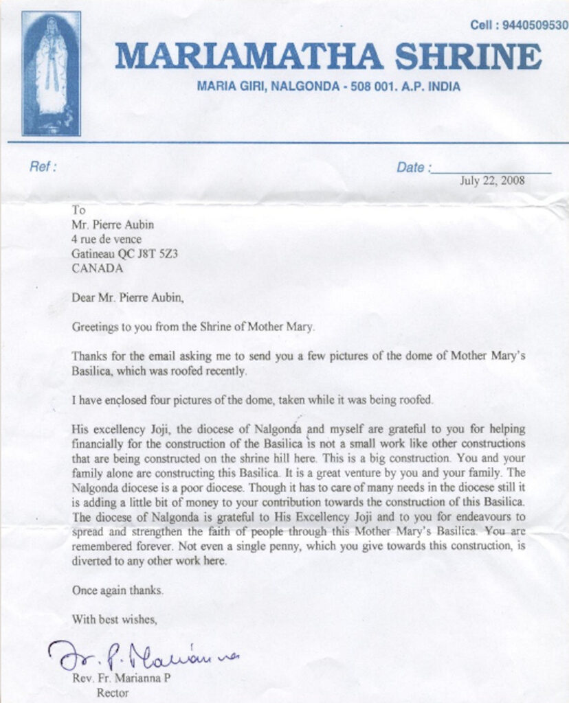 C’est au début de l’année 1999, à l’occasion d’un voyage en Inde pour suivre les projets soutenus par la fondation dans le diocèse de Nalgonda, que Pierre et son épouse Aline Laliberté ont été informés d’un projet de construction d’une basilique dans la ville de Nalgonda.