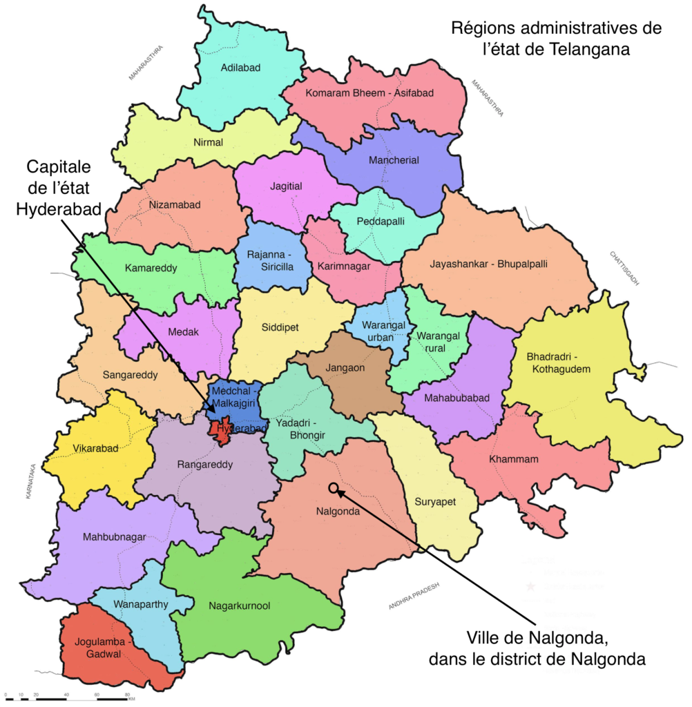- District de Nalgonda (en anglais), dans l’état de Telangana, sur un territoire que couvrait l’état d’Andhra Pradesh jusqu’en 2014.