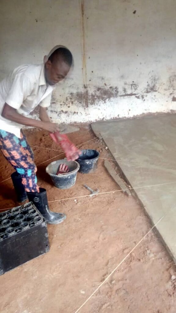 Deux classes de l’école maternelle avaient besoin de travaux pour être plus fonctionnelles et plus sûres. Il fallait notamment boucher les trous et appliquer un enduit sur les murs, et couler une dalle sur le sol en terre battue.